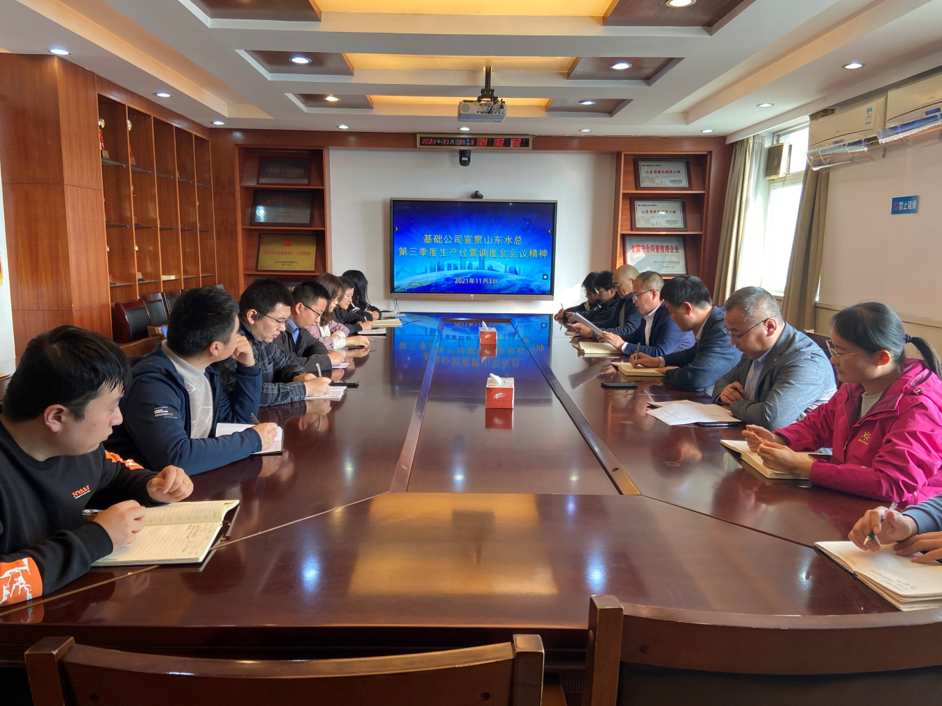 11月3日下午,基础工程有限公司在七楼会议室召开第三季度生产经营调度会议暨宣贯会议。总经理朱兆同主持会议并讲话,公司驻济人员参加了会议。