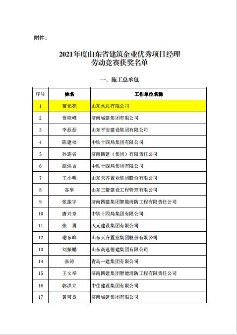 近日,由山东省建设工会和山东省建筑业协会组织开展的《2021年度山东省建筑企业优秀项目经理劳动竞赛活动》落下帷幕,经双方组成的工作委员会评议审定和综合评审,我公司苗元亮、卢正雷、蔡国森三名同志被评为“山东省建筑企业优秀项目经理”。此项殊荣是山东省建筑行业项目经理的最高荣誉,旨在鼓励受表彰人员再接再厉,发挥引领示范作用,创建更多精品工程。