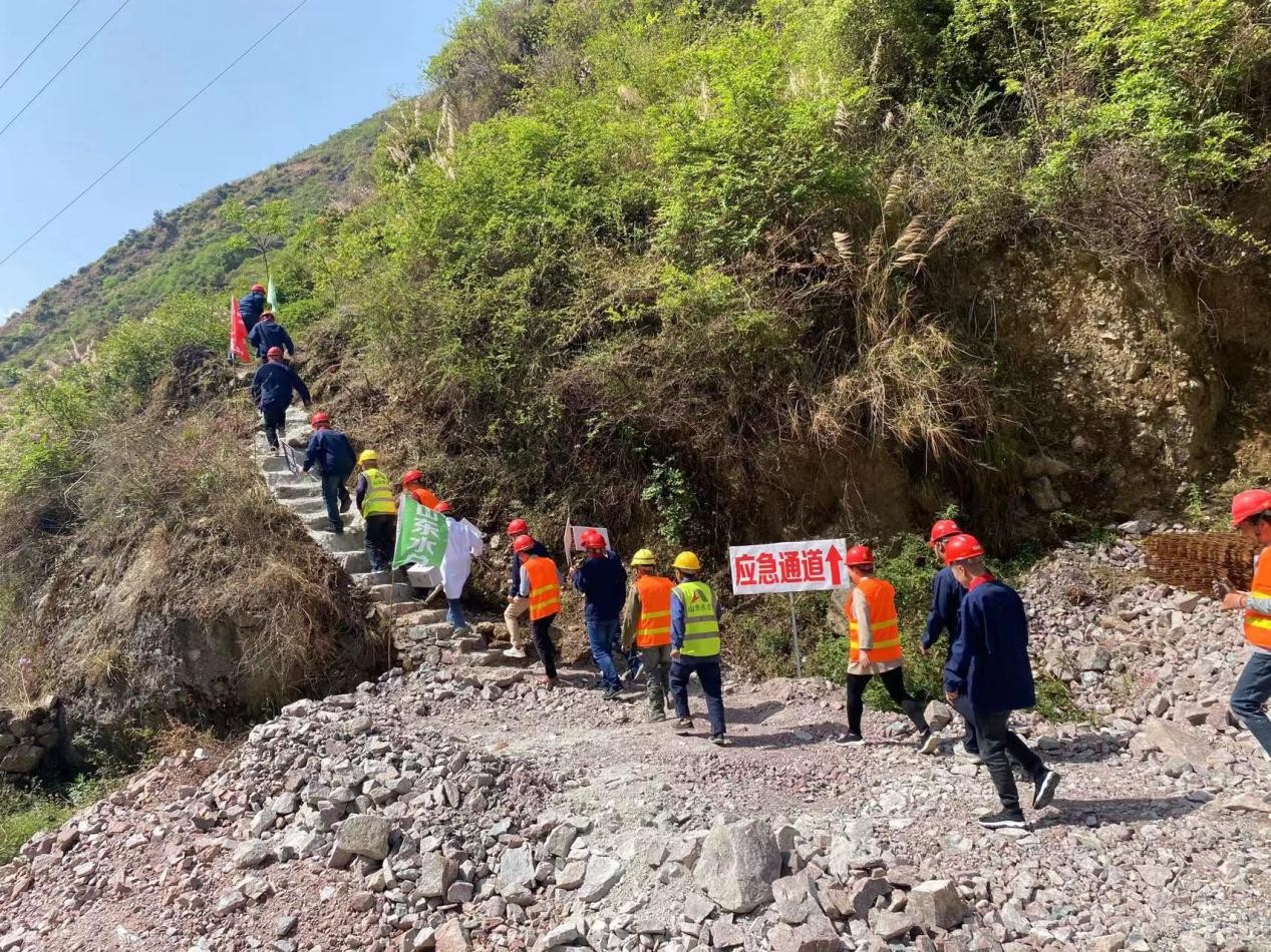 本次演练以庙基坪改线隧洞进口工作面“突遇强降雨爆发山洪”为演练背景,按照应急方案,先后通过信息报告及预警、应急预案的启动、各救援小组紧急集合、现场人员的紧急疏散、施工现场的应急抢险、现场伤员救护等方面展开。