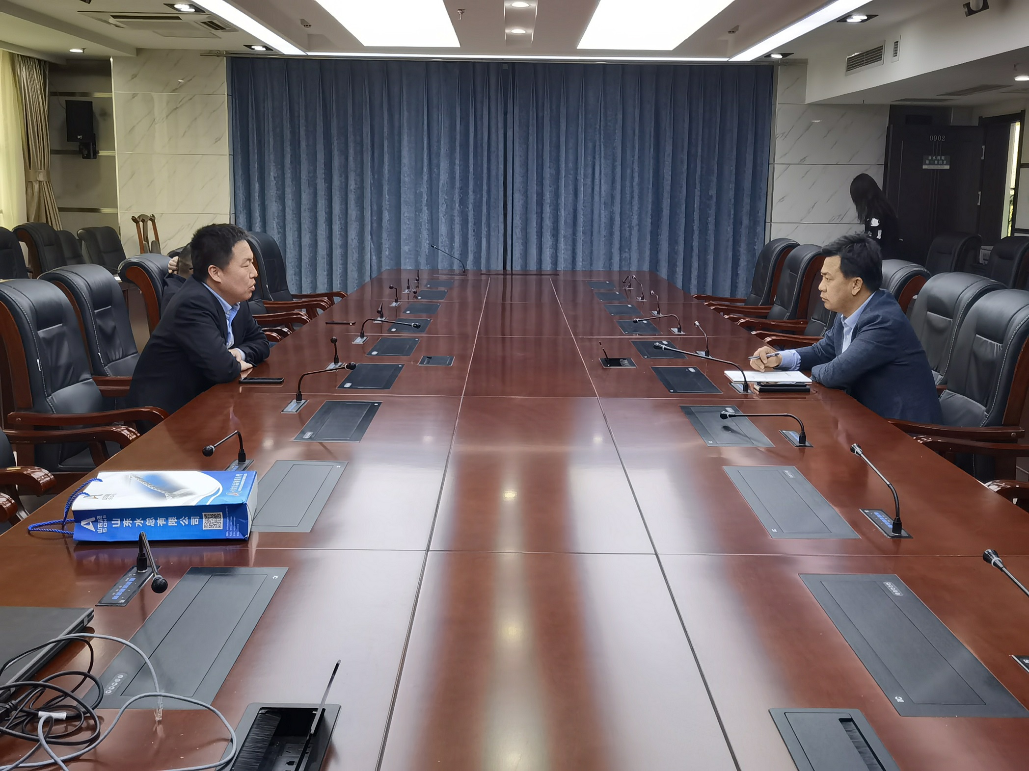 随后,靳文硕等一行到青岛区域协同发展办公室同李丕明主任进行座谈交流。李丕明对靳文硕一行表示热烈欢迎,并对水总在青岛区域的投资建设给予大力支持,希望双方在此基础之上再进行深入探讨,力争实现更深层次的合作发展。