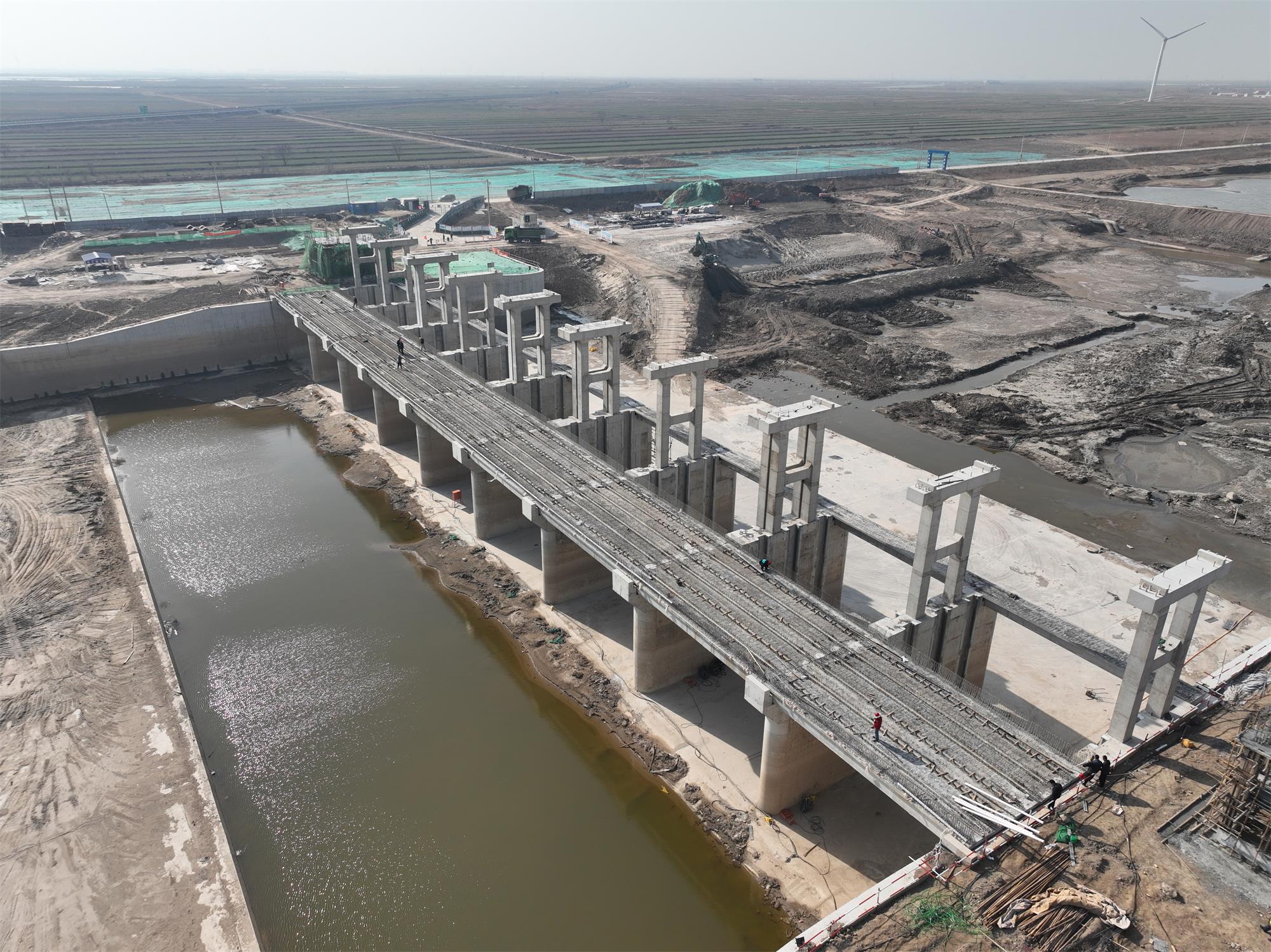 该项目自2023年开工以来,项目部秉着“起跑即冲刺、开局即决战”的理念,克服临海大风恶劣天气、高空作业及工序穿插作业等困难,通过项目部人员集思广益,优化施工方案,严格把控施工质量,牢记安全红线,一个月内完成闸门安装、交通桥板、检修桥板及机架桥板吊装等工作。
