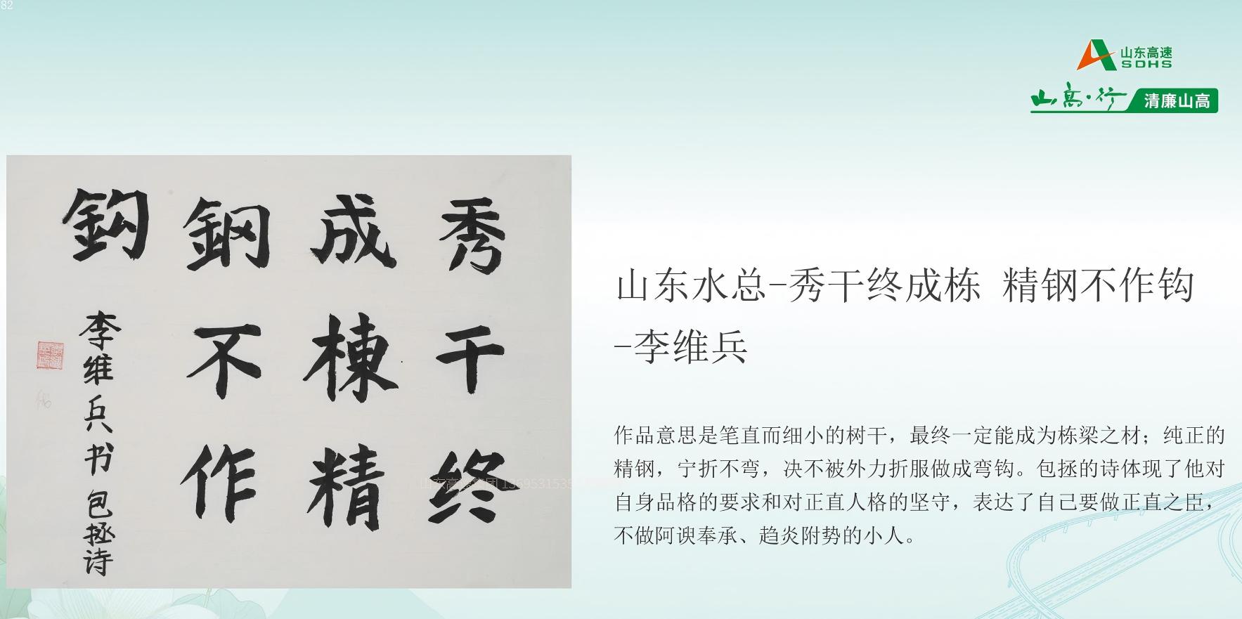 6月11日,在山东高速集团纪委组织的“清廉山高”廉洁文化作品征集活动中,M88基础工程有限公司制作的短视频《筑廉洁防线,守初心之路》荣获“光影映廉”板块三等奖,第二分公司李维兵的书法作品《秀干终成栋,精钢不作钩》摘得“工艺创廉”书法类优秀奖。