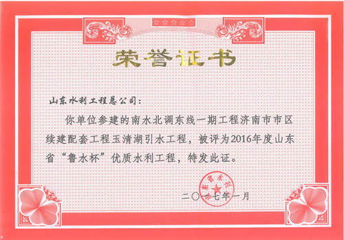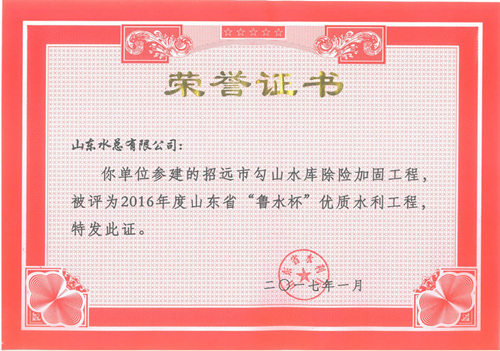 公司“招远市勾山水库除险加固工程”等八项工程被评为2016年度山东省“鲁水杯”优质水利工程